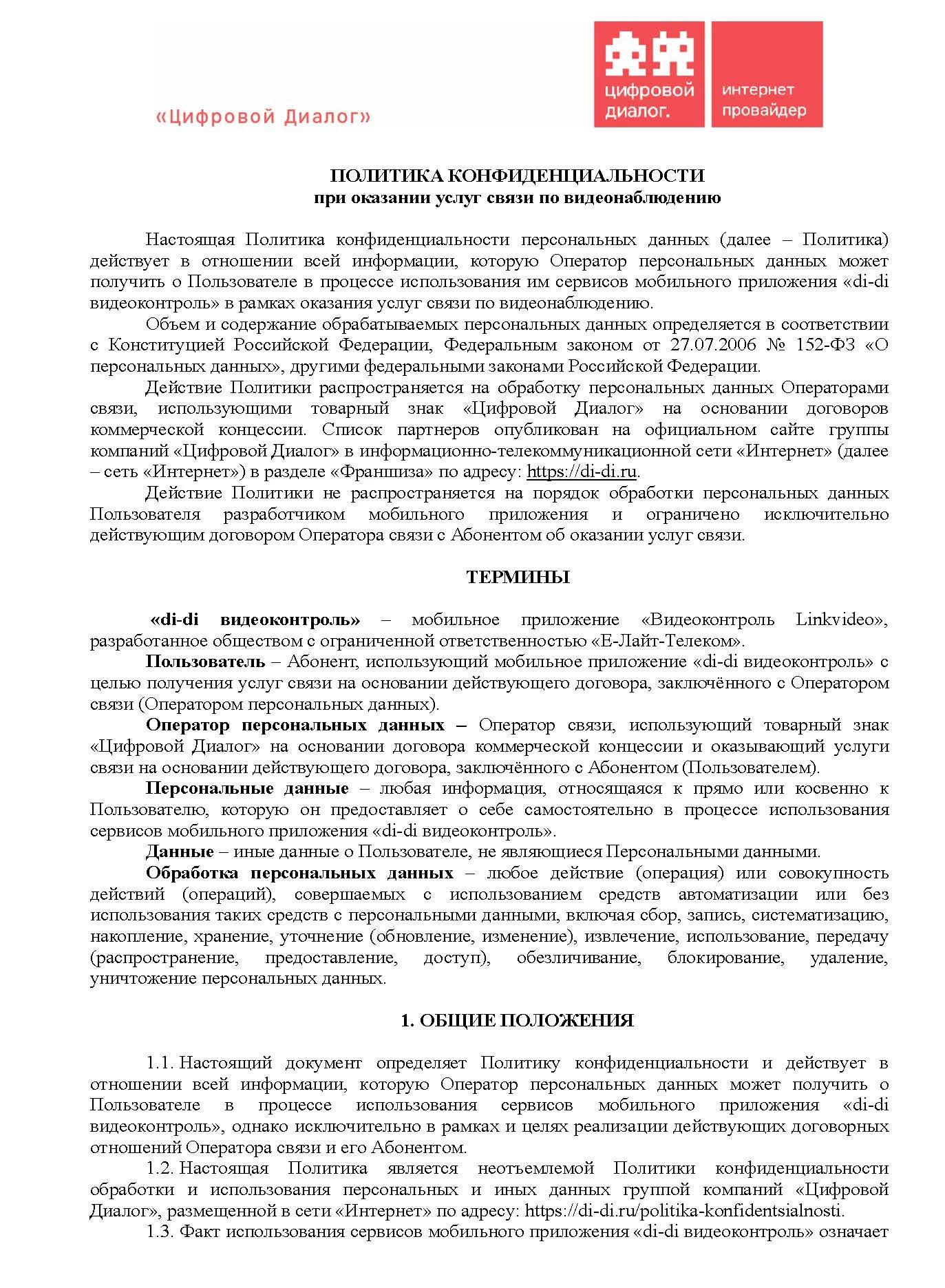 ПОЛИТИКА КОНФИДЕНЦИАЛЬНОСТИ при оказании услуг связи по видеонаблюдению